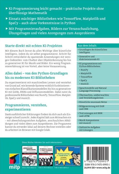 Dank klarer Erklärungen und anschaulicher Beispiele findest du dich auch als Einsteiger schnell zurecht. Du lernst alle wichtigen Techniken kennen und setzt sie direkt um - von einfachen Klassifikationsmodellen bis hin zu generativer KI mit GANs, RNNs und Diffusionsmodellen. Dabei nutzt du professionelle Bibliotheken wie NumPy, TensorFlow, Matplotlib, SpaCy und music21.